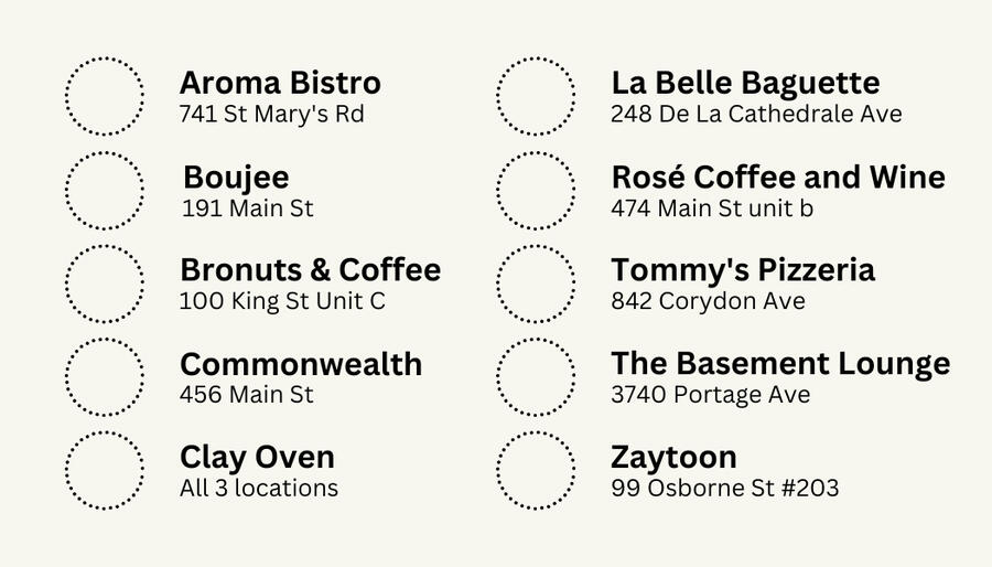10 local restaurants. 10 delicious discounts. All for just $25. You’ll get 10 one-time 10% discounts to some of Winnipeg’s best spots!It’s the perfect way to support local and discover some of the city’s hidden gems.Only 250 cards will be available, and once they’re gone, they’re gone.Here are the 10 spots: